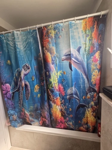 Rideau de douche motif océan avec tortues et coraux, idéal pour une décoration marine de salle de bain. Accessoire pratique pour préserver l'intimité et éviter les éclaboussures d'eau. Design élégant et apaisant avec illustrations détaillées de la faune marine. Parfait pour les amateurs de décorations marines et océaniques, ajoutant une ambiance sereine et naturelle à votre espace.